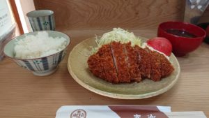 幸楽さんで食べる久しぶりのとんかつに自然とテンションがあがってしまいます。とんかつ以外に赤だしのお味噌汁(なめことお豆腐入り)、香の物が付いてきます。