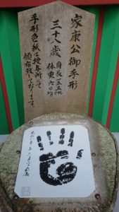 その他には家康公の御手形が楼門の後ろに置いてありました。この手形は家康公38歳の時のもので、身長は155cm、体重は60kgの時のものだそうです。あまり体格は大きくなかったんですね。