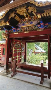 本殿まで真っ直ぐにいければいいのですが、唐門前の石段は通行禁止となっていますので、神楽殿を右折して、日枝神社の横を通って国宝の御社殿まで向かいます。山の麓から御社殿まで長い道のりでしたが、ようやく到着しました。