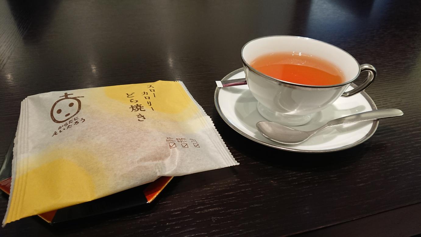しばらく待っていると温かい紅茶とお菓子が運ばれてきました。今回のお菓子は『どら焼き』です。どら焼きは好物だったりするで、これは嬉しいヽ(*´▽)ノ♪