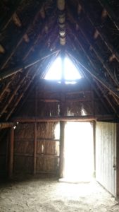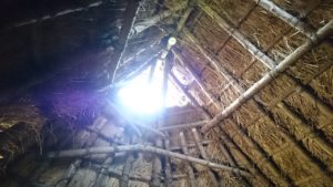 まずは、丸屋根の住居から見てみましょう。中に入ってみると円形になっているためか外で見るよりも広く感じました。また、その日は日差しがきつく暑かったのですが、地面は湿った土の床になっていて中は結構ひんやりとしていました。屋根の左右には光と風を取り込むための天窓が付いており、中々風通しもよさそうでした。