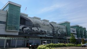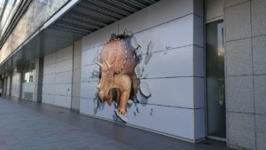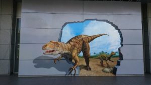 その他にも、福井駅の壁には恐竜が飛び出して見えるトリックアートが描かれています。壁の向う側は恐竜の居た時代と繋がっているかのようですね。