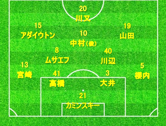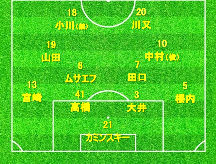 2トップには川又と小川航基の組合せを持ってきました。そして中盤には司令塔タイプの中村と山田の2人を配置。中盤からパスを供給して前線の2人と両サイドの宮崎、櫻内を生かして攻撃を行う形です。サイドから中にいる川又、小川両名にクロスを上げてもいいし、中央から中村、山田、田口、ムサエフの4人で崩して裏のスペースを狙うのも面白いと思います。