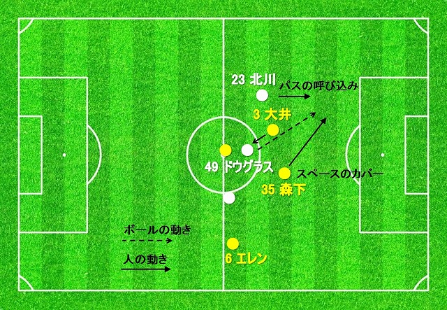 北川の状況が見えていたかは分かりませんが、あのタイミングでプレスを掛けに行ってもドウグラスとは距離が離れていますので、プレスを掛けにいくメリットはなかったはずです。どうしてもプレスを掛けに行くのであれば、大井ではなく、左サイドの森下が中へ絞ってプレスを掛けに行く方が良かったと思います。